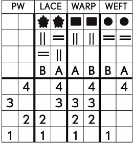 A counter-marche loom is like a jack loom and a sinking shed loom combined into one loom. That is why you have 2 setts of lamms. Your upper lamms act like a sinking shed loom and your lower lamms act as your rising shed loom or jack loom. That is why you have to tie-up both parts on a counter-marche. It is twice the tie-up as the other types of looms because you have to tie-up the lower lamms like a jack loom and the upper lamms as a counter-balance loom…..