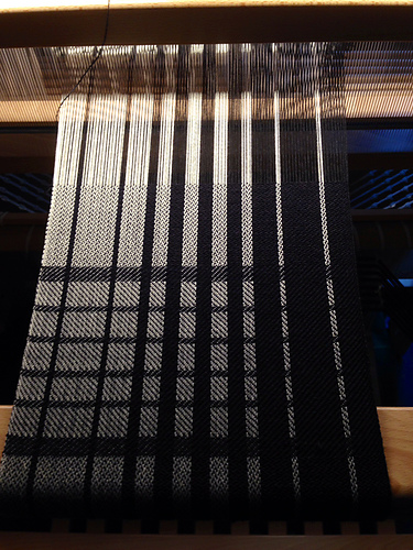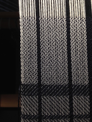 I was just weaving away and noticed that what I was weaving is a good example of controlled draw-in or taping of the selvedge. This is a fine warp Bambu 12 sett at 27 epi and the weft is Zephyr (silk/merino) woven at 27 ppi. Because it is black and white you can see the beautiful selvedge you get with the weaving method I describe so often….. Throw, Beat, Leave It…meaning, leave your beater against the fell Change your Shed Beater Back to the Castle. You are beating on an open shed allowing the shed to take what it needs, you have some draw-in. This piece is 9.5” in the reed and it is 8.5” when woven…so I am drawing in 1” total. The selvedges are clean, strong and supportive to the rest of the cloth. It is so easy to see on the left hand side because it is black and white. The selvedge is denser. The reed lines will all disappear when it comes off the loom and is washed.