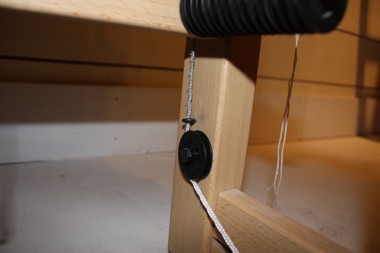 Question: Hi Jane, Since I started great workshops with you I lusted after a Spring Loom and have acquired an older model second hand one. I love my Spring for all the great things it does for me, e.g. tension and great shed, but have a slight problem and I need your advice. How can I stop the pulley cords from slipping off the lower lamm pulley wheels? This happens on occasion whilst I am weaving and I am not sure what I should do to adjust this problem.