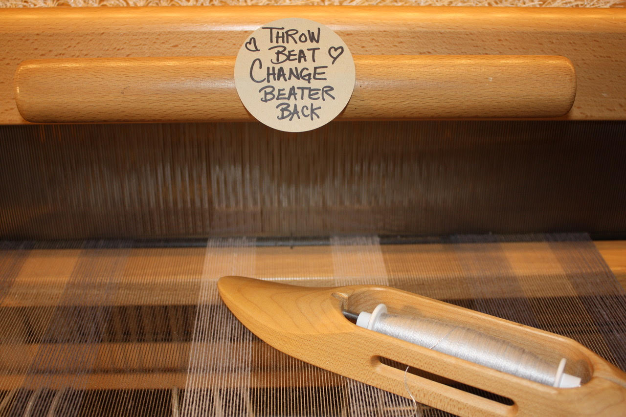 The sequence that you use to throw each pick is very important. I throw the shuttle and then beat on an open shed. I leave the beater against the fell of the cloth while I change the shed and then I bring it back to the castle after I have changed the shed. So this is the sequence: Throw, Beat, Change, Beater Back …… Throw, Beat, Change, Beater Back. (See Thought #8 for the additional tug that could be given at this time if needed.)