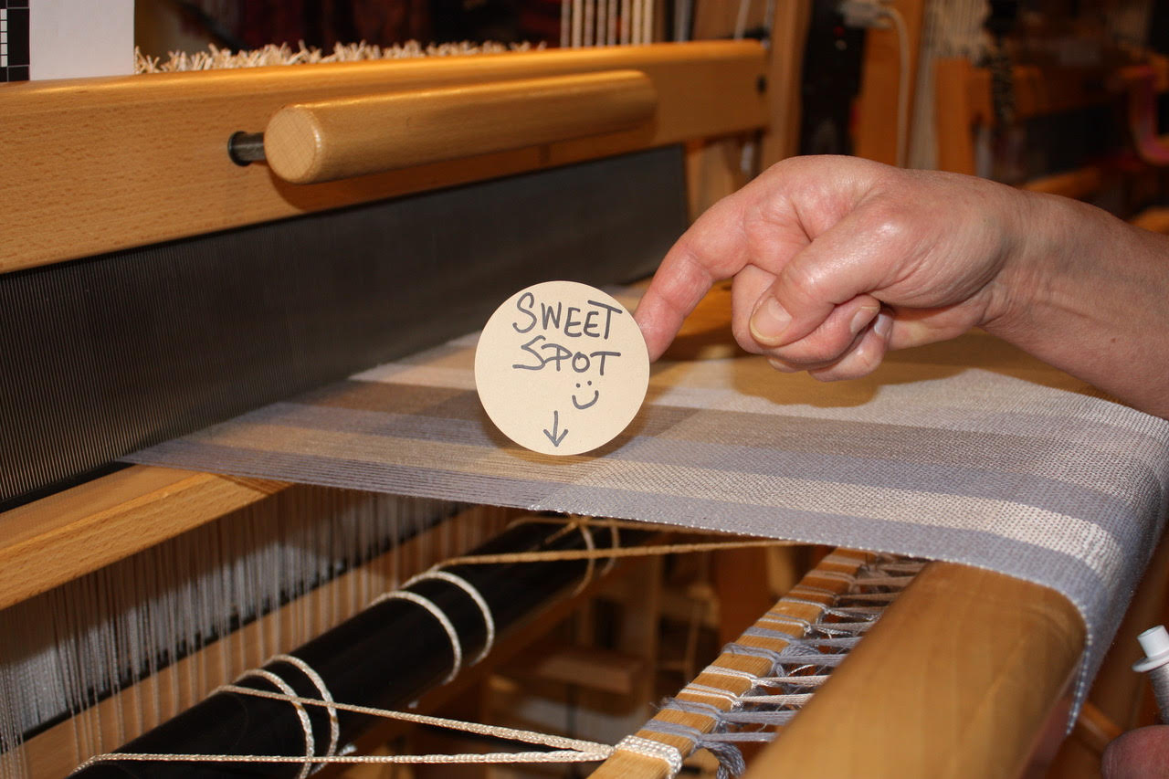 - When the shuttle hits my right hand, my eye is watching the left selvedge. That’s because the right hand is controlling the tension on that left selvedge.