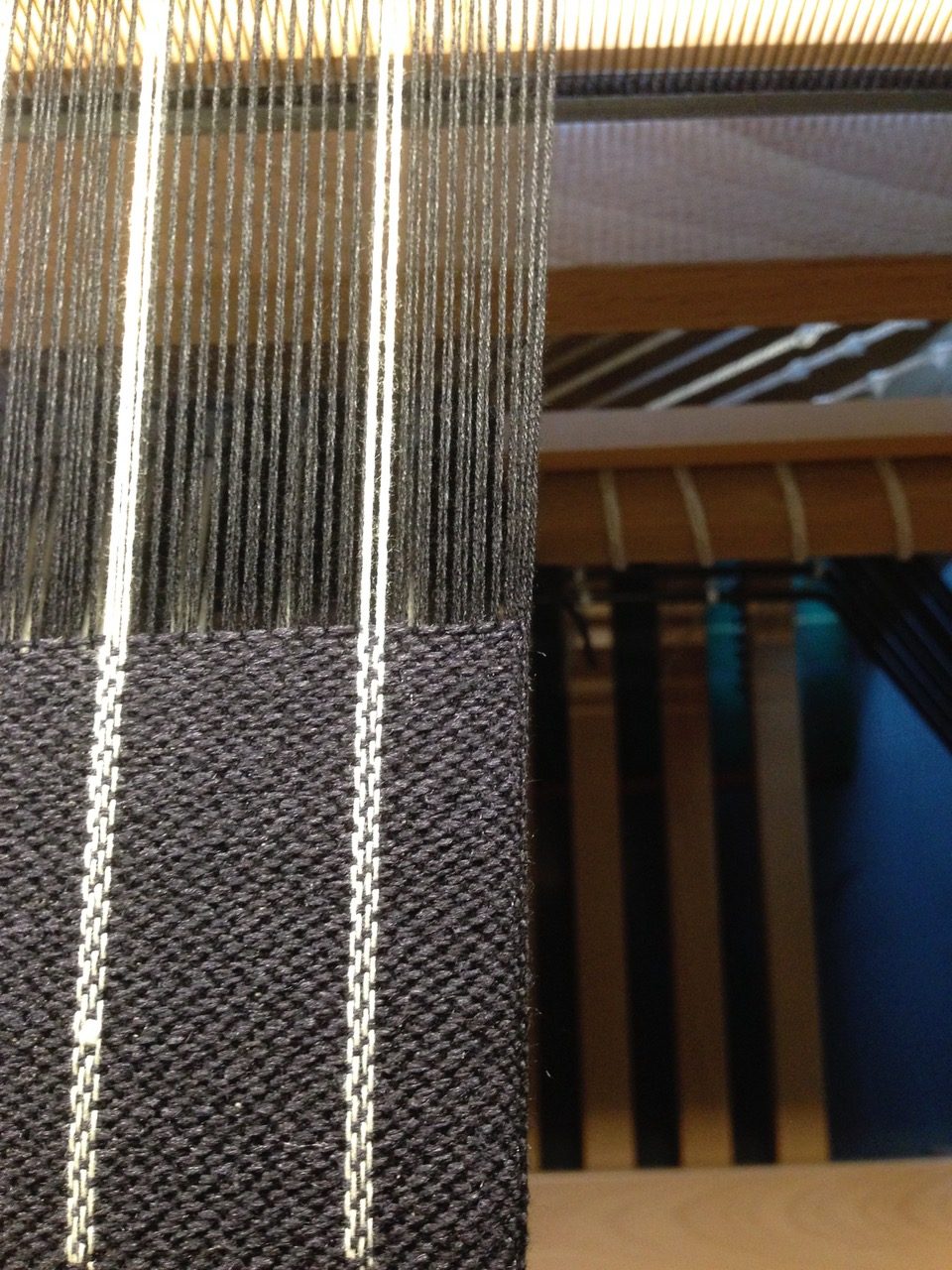 - My eye then travels to the centre of the loom and watches as the beater comes down with its weft yarn. (I am often looking at the negative space in my weaving to get the proper picks per inch. If you are weaving a balanced fabric, then the negative space should always be forming a square. It is easy to watch for those squares.)