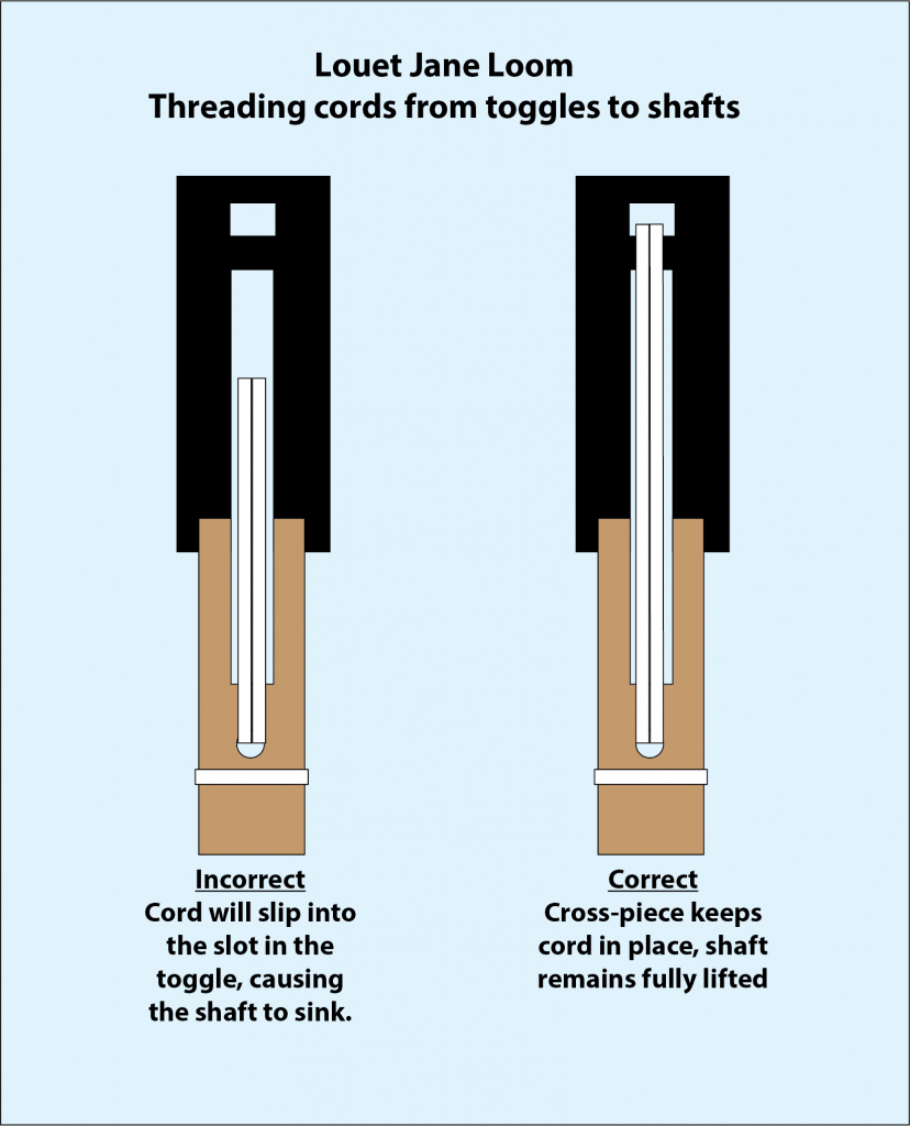 Question: Hoping someone can help me with a shed problem on my Jane. I purchased my loom and stand used. The loom is in excellent condition overall and has the upgraded rollers. My problem is related to the lifting action of the toggles. When I begin to flip a toggle down, the shaft rises as expected. However, when the toggle goes all the way down, the cord slides into the toggle’s slot and the shaft slips down a bit. I could live with that, but unfortunately, there’s a big difference between the amount of slip. There’s not much on shaft 1, then an increasing amount of slip as you go up to shaft 8………………
