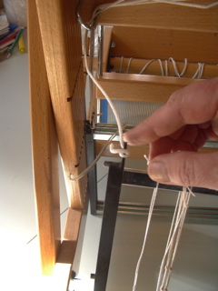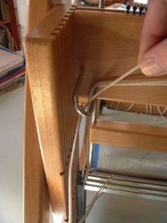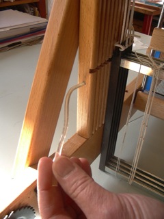 Follow Jane’s hands and words to set up a Kombo Table Loom. At the back of the loom there is a little wormy thing on the left hand side. Make sure it is out.