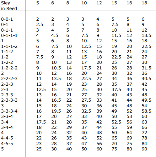 I think that weavers need to have a couple of reeds and my favourites are 6, 8 and 10. You can print a reed substitution chart off the website that will help you use the reeds wisely. Across the top of the chart in bold numbers are the most common sizes of reeds available (except 15 and 18 are really for very fine yarn). Under each number, there is a column with other numbers progressing from small to larger numbers. Those numbers are all the possible ends per inch that you can get from that reed if you sley it in different ways. The next thing you will notice is a set of numbers out in the left-hand column. Those numbers tell you how to sley the reed to get the epi in the reed.