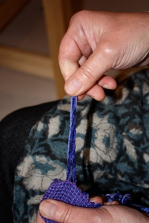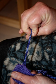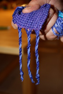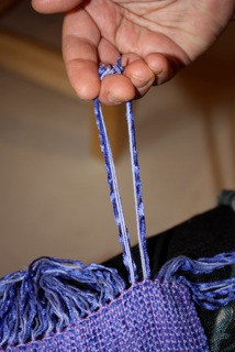 I finish my chenille scarves, shawls, etc. by hemstitching on the loom in bundles of four (two wasn’t heavy enough and 6 looked too big). After the cloth is cut from the loom I take two of the bundles of four and tie a knot at the very end of the fringe, pulling on it to make sure it’s tight. I do this all the way across making sure that the knots are evenly matched in length on the fringe. I wash the scarf by hand in the sink and spin it out gently in the washing machine or wrap it in a towel to get rid of the excess moisture. Hang to dry. While it’s still damp, hold the cloth firmly with your left hand and with your right hand, pull down on one knot and twist the fringe to the left. It will want to go in that direction. Let it dry. After they have dried I cut the little tuft off back to the knot. I put them into a hot dryer for just 1 minute to soften them up. I don’t like them to be in there any longer. Remember this….whatever you take out of the lint trap has been stripped off your fabric. Chenille is a woven yarn with exposed wefts that make it fringey….the dryer likes to suck that stuff off and if you leave it in the dryer too long you will be basically throwing your yarn away. See the series of photos below that will “walk” you through my process.