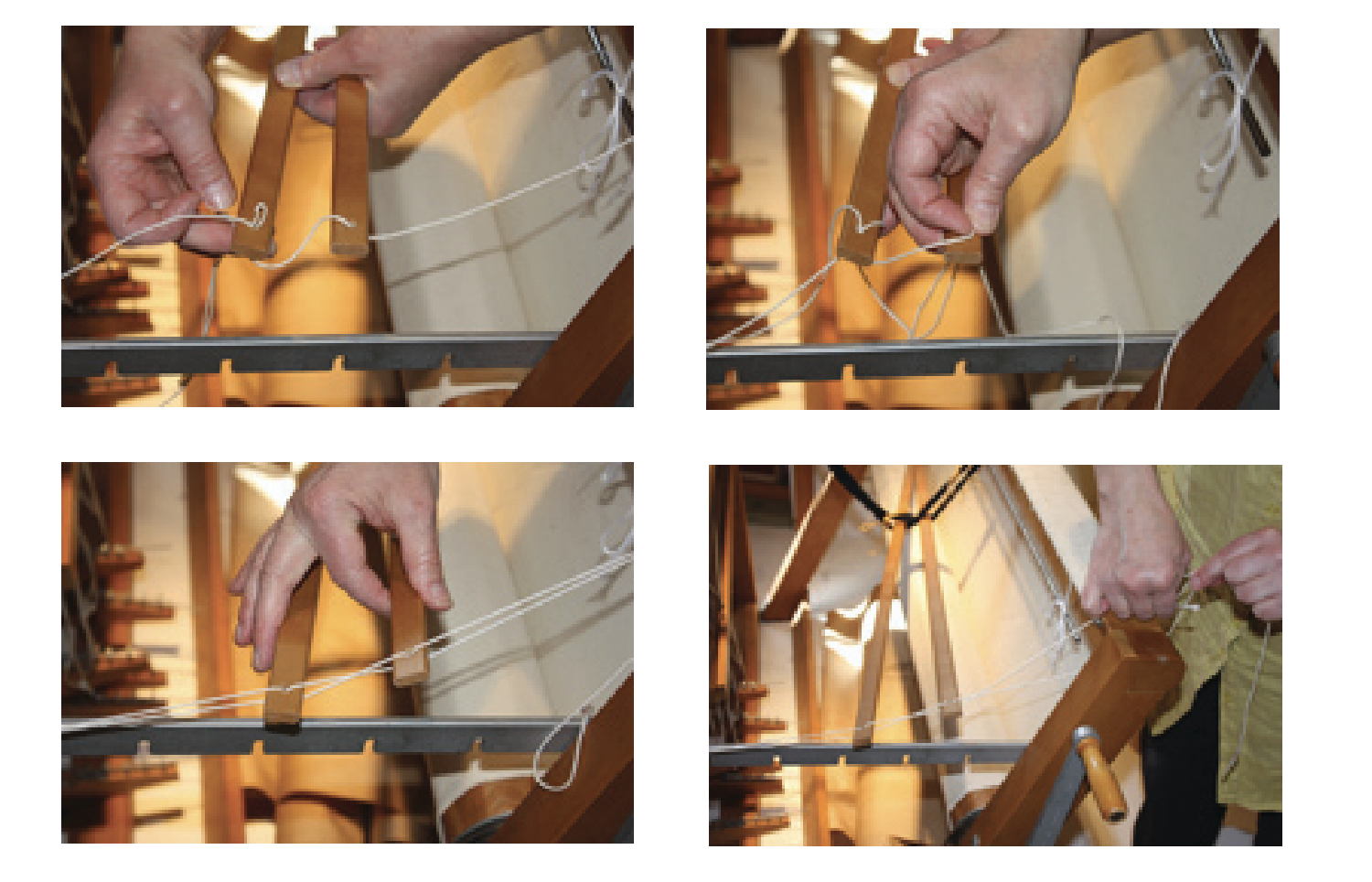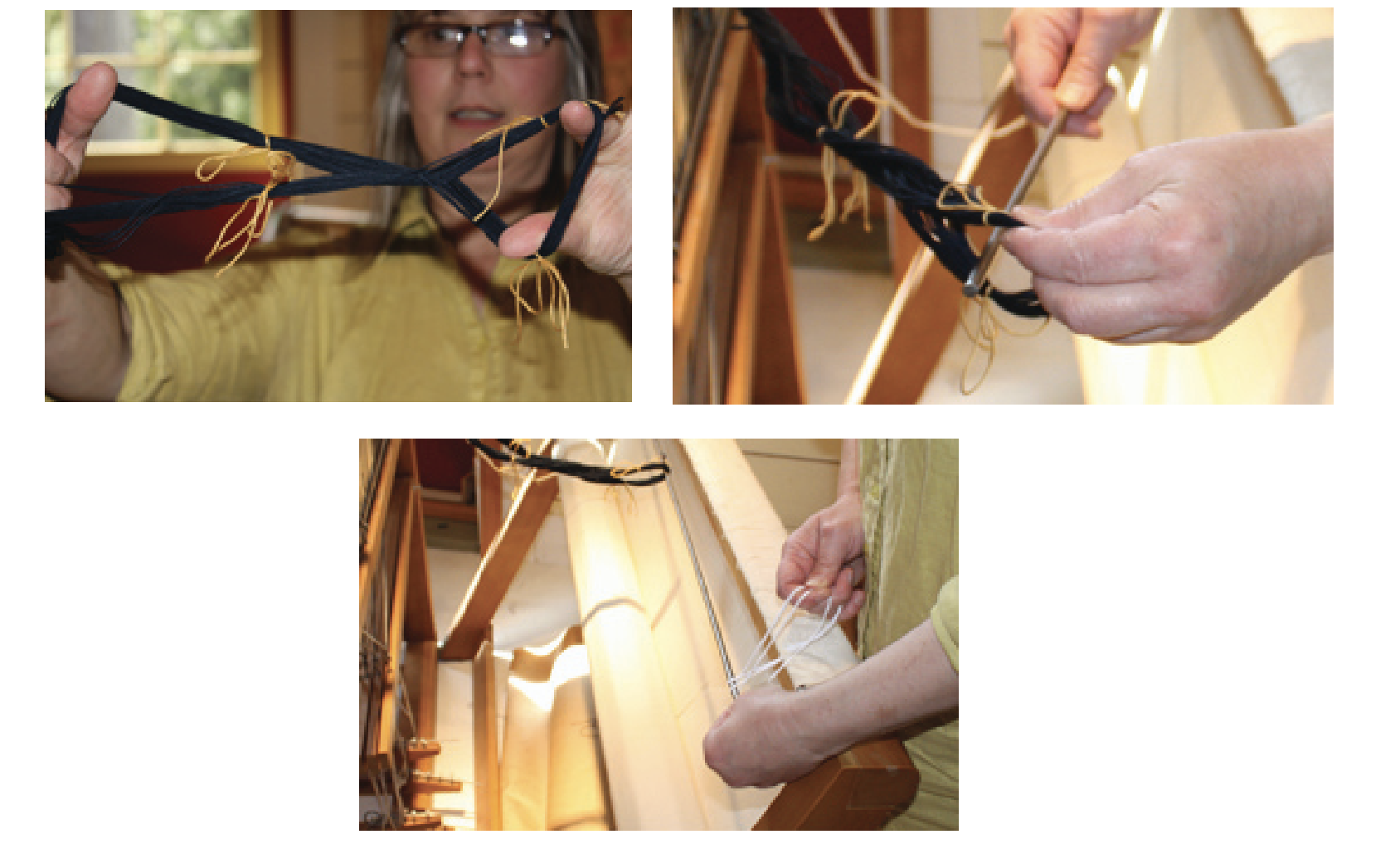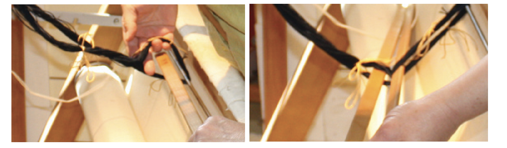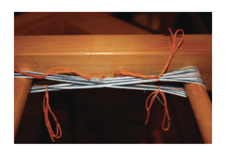 - The cross end of the warp forms a loop. Slide a rod through this loop. Attach the warp rod to the apron rod at their ends leaving a one inch space between them. (Half-hitches)