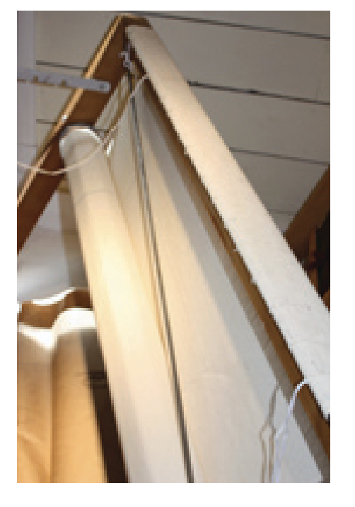 - Roll the warp onto the back beam feeding paper between the layers of warp. (For fine threads, the paper provides a more even bed between the layers than warp sticks). Keep an eye on the paper, making sure it is rolling on evenly and adjusting it if needed.