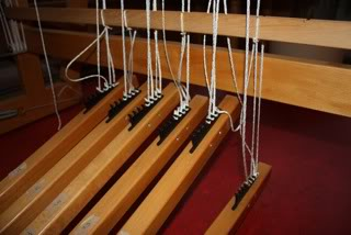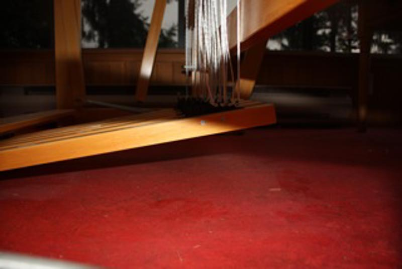 The warp should be coming through the reed somewhat in the lower middle. Below are shots of the treadles and tie-up cords. The long cords should be 23 1/2″ long off the lamm. The short cords should be 15″ long off the lamm. All long cords run in front of their lower counterpart.