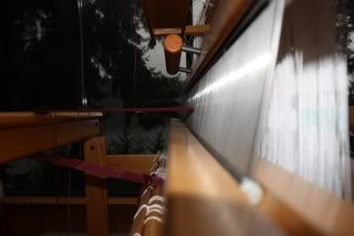 Here are some photos to show you what you will have when your loom is fine-tuned. The first few shots are of the loom with the blocking pin in so you can see where things should be when the loom is in neutral.