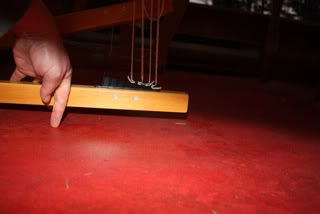 The next picture shows where you adjust the height of the beater. If your beater is too high, your shed will never fully open. The little feet that screw into the vertical beater legs are on a screw that is about 7″ long. You can screw them in or out to adjust the height of your beater. Do this when you have a warp on and when you are stepping on a treadle. Your shuttle race should support the lower part of your shed when the shed it open. Don’t even try to adjust your beater unless there is a warp on. These last photos show the treadles with the blocking pin out. When you step on a treadle some of the cords on other treadles will go slack. That is completely normal. The treadle should not hit the floor when fully down (see my finger).
