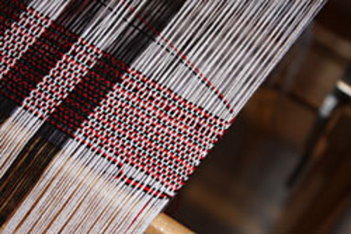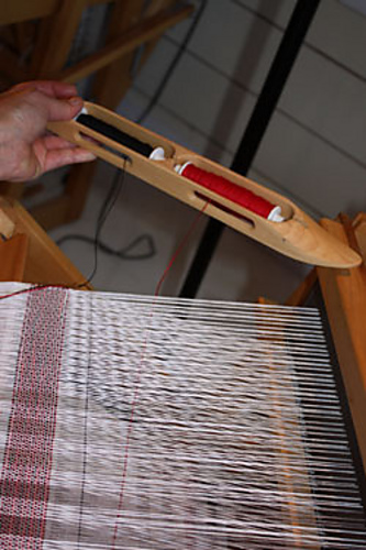 When the double shuttle comes out of the shed, one bobbin will be on the outside on one side of the warp and on the inside on the other side of the warp. This means that those two different bobbins alternate being on the outside at the turn of the selvedge. Sometimes I have to twist my wrist a little to equalize the lengths of the two ends just to keep everything moving along nicely. Before I throw the shuttle my wrist comes back to even up the length of both ends.