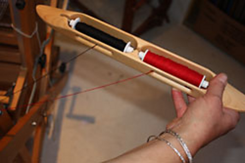This is common when you wind two ends together. You can get a shuttle that has a place for two bobbins but it still happens because of how the weft turns the corner at the selvedge. However if you do have a shuttle for two bobbins it is easy to rewind one a little bit every now and then. This happens because one of the two yarns is always on the outside turning the corner so the inner one gets longer. If you don’t have a double shuttle, the best thing to do to avoid the lengthening of one end is to weave 2 single shots in the same shed. It does take twice as long to weave but your selvedges can be very clean that way. If you choose this method you will need a floating warp thread at each selvedge. Normally I think they are a pain in the you know what, but in this case, it is the only way to control that lengthening stuff. See below for photos showing how I weave with two threads. The nicest solution is the double shuttle shown in the 2nd photo below: The first photo illustrates the initial problem.
