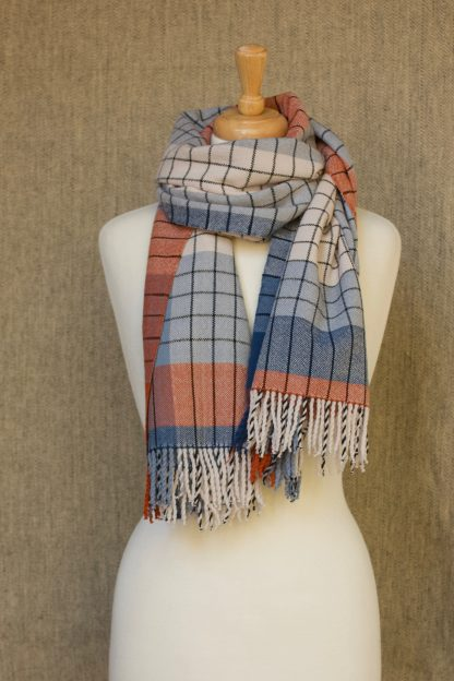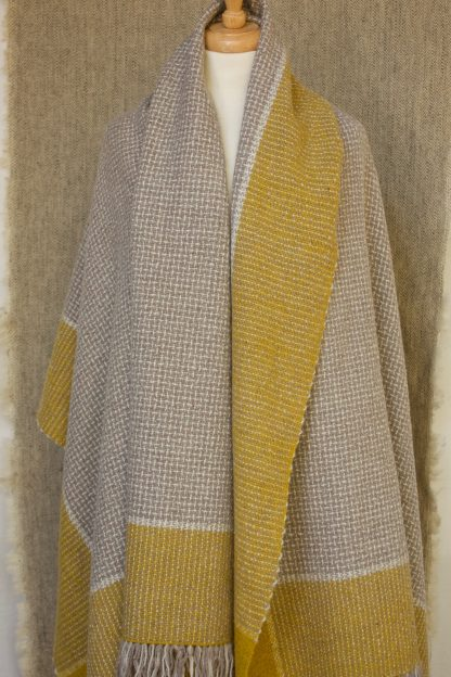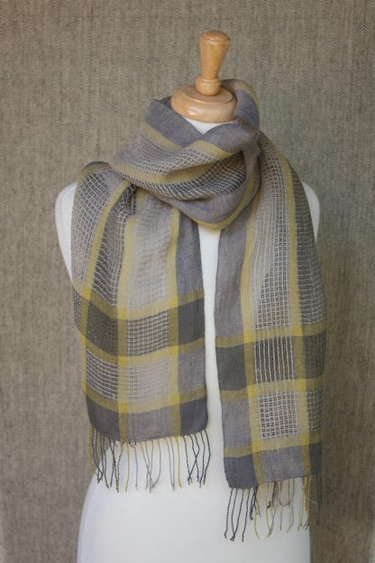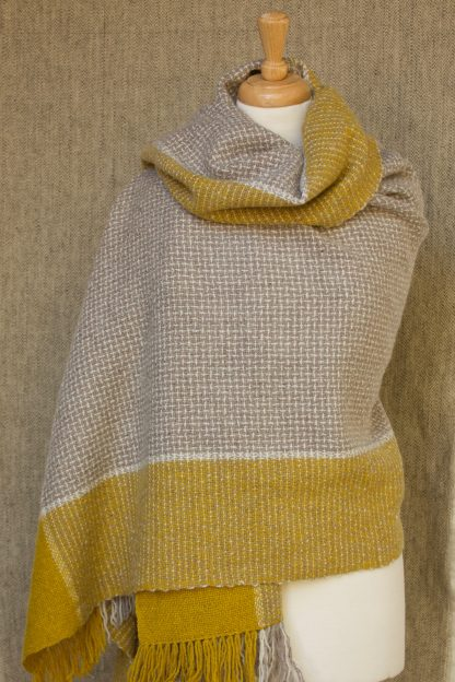 ‘Blankie’ is woven using Harrisville Shetland in PW at 8 epi and 8 ppi. Linda pulled one of the Colour and Weave threadings (DDL) from the guild gamp and used it for the body of the blankie.