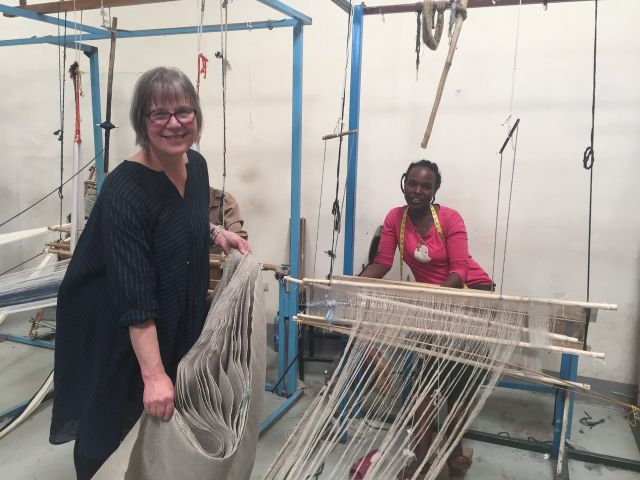 Below is Kathy Marshall, the founder and owner of Sabahar with Degu, the Weaving Production Manager.