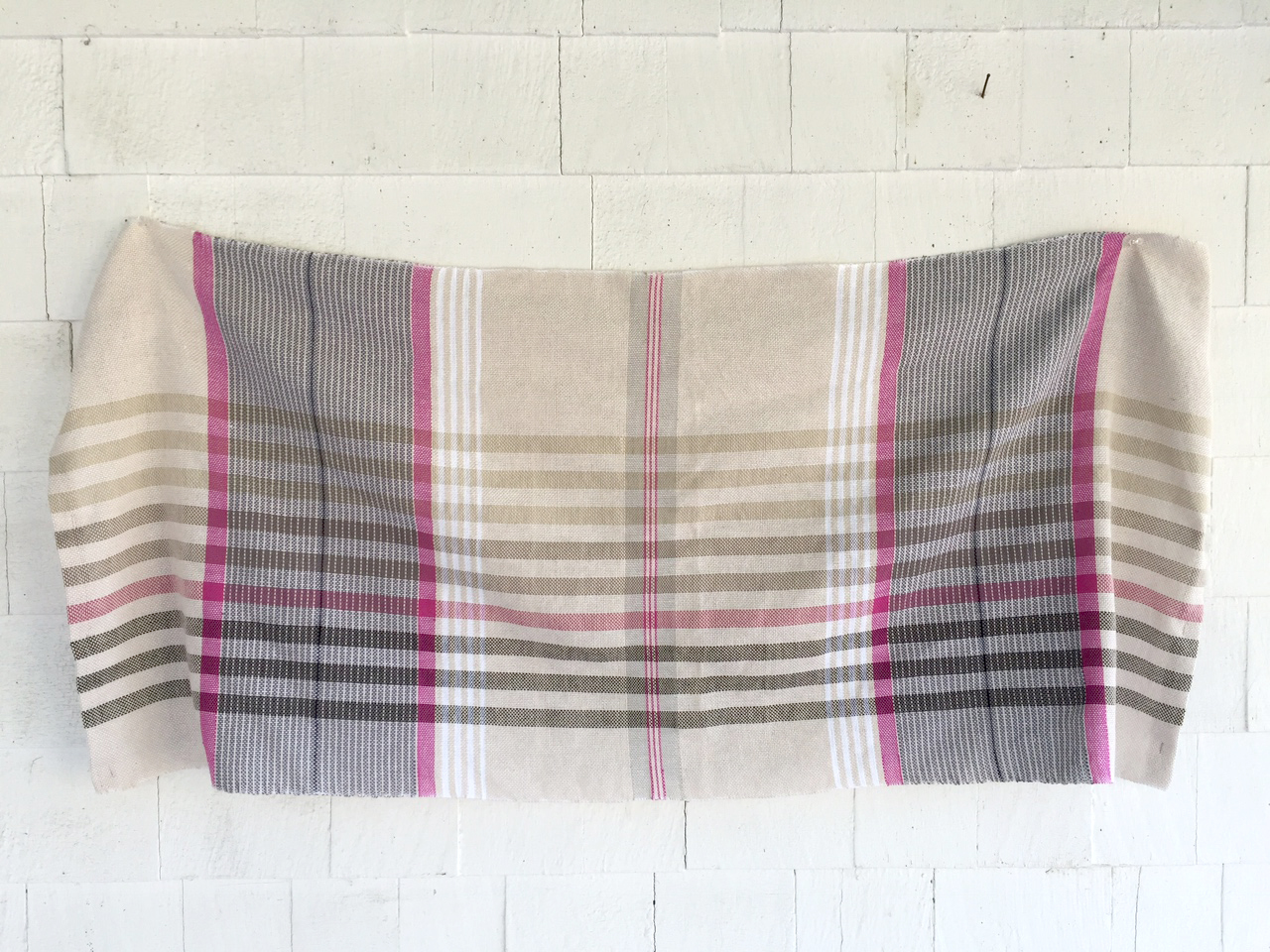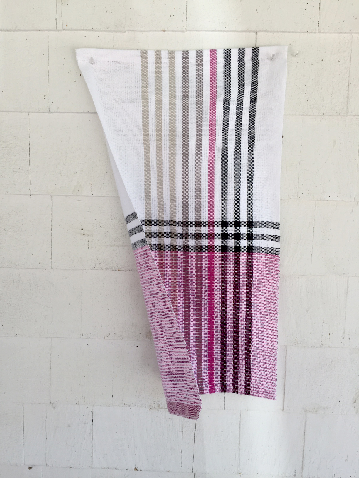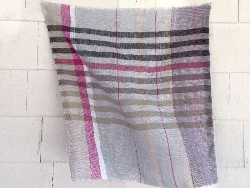 In the first project, the Asymmetry draft, I swapped out the red for a deep pink which was readily available in my stash, a color I knew would work well with the greys. In planning the subsequent pieces for this project I tried to make my weaving “deliberate” and have a finished piece in mind. In the past I have tended to weave to a firm plan as far as the warp and structure goes, and would then get bored, changing up the weft as I went along. I’m finding that the more intentional a project is the more I like it. I make an effort now to dial back on the randomness. This towel is woven as written: 8/2 in warp and weft and a sett of 18.