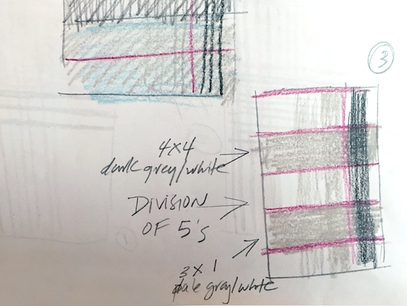 Below is the preliminary sketch that I “poured the detail” into. It is a division of space in 5s.