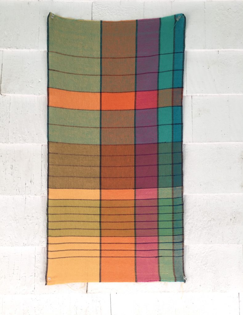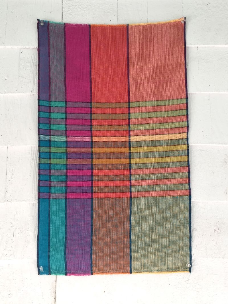 I had a great deal of fun with Parrot and loved the color play. I was missing one of the pinks and swapped it out for another blue. As I started to weave it was the colors created by the weft on top of the warp that really caught my interest. The layers of transparency added depth and the more complex and murkier the color the better. In this piece I especially like the brown, earthy tones created by those overlapping colors.