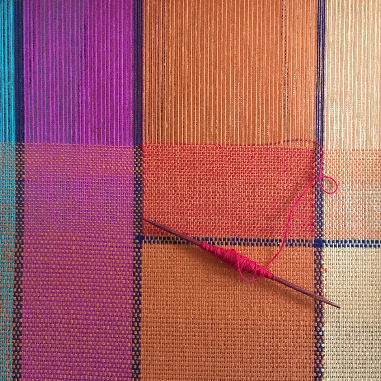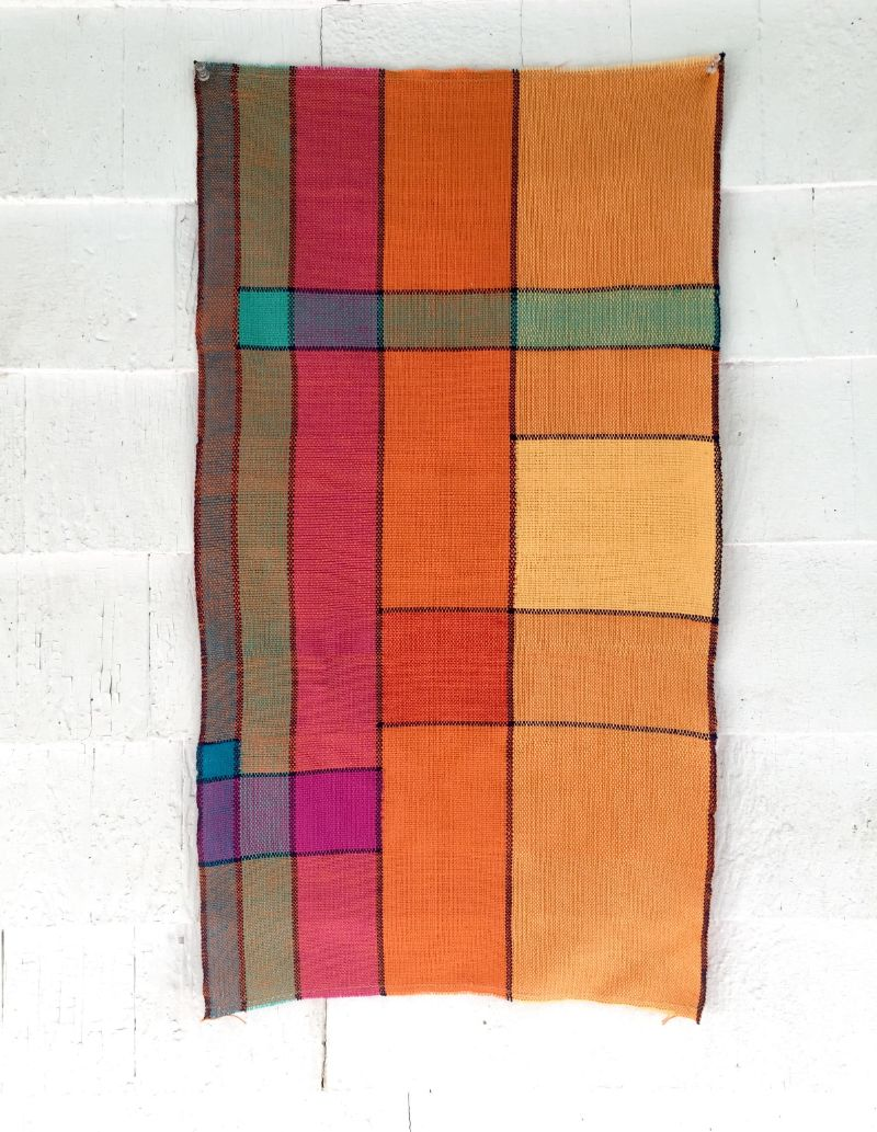 I had a Piet Mondrian grid in mind when I started this piece. I focused on “making squares” and planned for a pure color square of each of the warp colors as I approached from either side by using the clasped weft technique. The only color that could not be reached was the red square in the center so in this instance I used the inlay technique described by Jane in the episode.