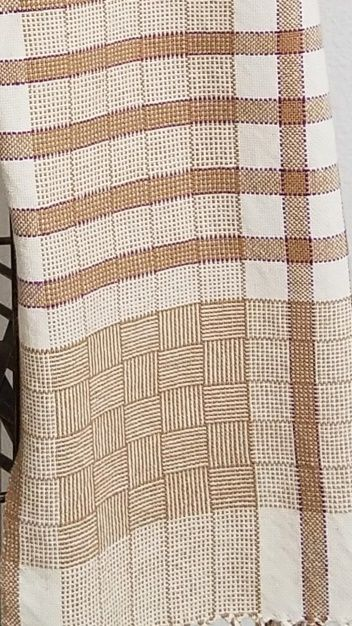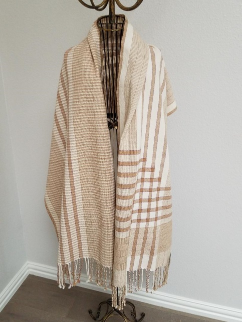 I was inspired to make this shawl after watching Season 3, Episode 3 on log cabin. I had woven a shadow weave baby blanket in the past, but had never woven log cabin. I was intrigued by how simple it was, but what an impact it made. I chose some yarns from my stash that were just looking for a project. They are 8/2 American Maid Naturally Colored cotton from Lunatic Fringe. I love how the colors darken over time with each washing. I used the dark brown and the natural with a sett of 18 EPI.