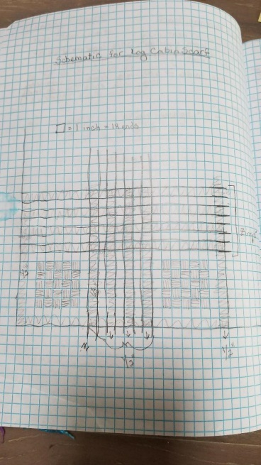 I made a sketch of what I wanted the two ends of the shawl to look like and then I was going to just wing it for the rest. I divided the warp into sections with log cabin on the ends and the stripes in the middle. I also added a purple zinger on each side of the stripes.