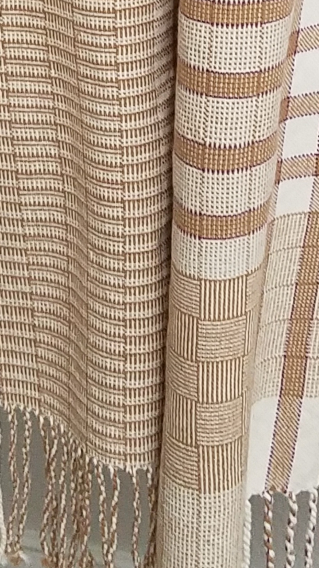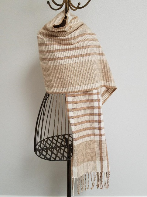I wove further and decided I really like an asymmetrical look on scarves so I started putting in small stripes using the weaving sequence dark, dark, light, dark. They were so much fun that I just finished off the shawl with the stripes.