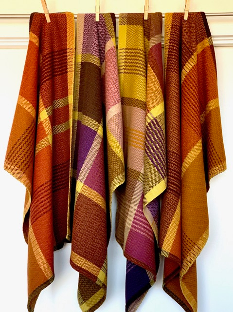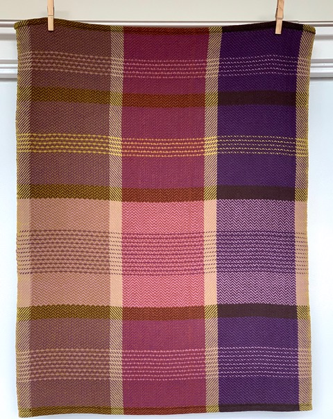 My favourite technique to play with is to use colour and weave sequencing options to produce some horizontal stripes, using Fibonacci sequences. This created some really interesting variations, making the cloth look totally different – almost as if I had rethreaded it. Very cool, and this effect was most interesting when the treadling sequences were an odd number, like #5 (1234-1-4321). I used either 2 or 4 picks per stripe so two shuttles were easy to manage – one on each side of the cloth. These stripes inspired me to use this idea in a plaid, and it worked well. The resulting patterns are not traditional plaids, but it’s still plaid-like. These are some of my personal favourites, especially the purple one.