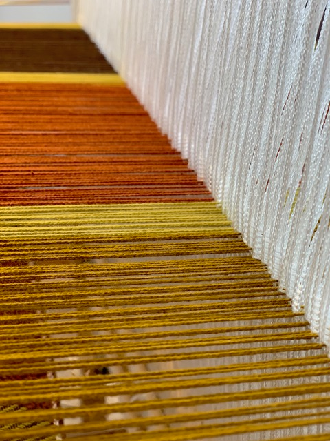 I knew I wanted to fill each big stripe with a different twill, and I also thought it would look cool if the curry-coloured edges and borders could be a different twill too. So, after studying the gamps I chose 3 different point twill threadings and a straight draw threading for the borders. This allowed me to make the intersections where the twills meet have clean, sharp lines.