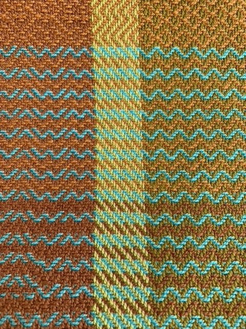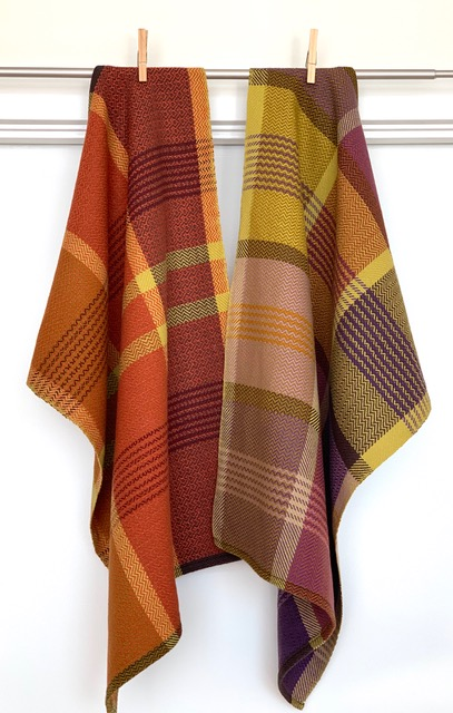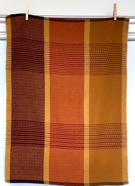 In the next few towels I used just one treadling sequence, except when I was adding framing borders in the warp colour, curry. In these cases, they were also treadled in a straight draw, which made the frames and borders more distinctive.